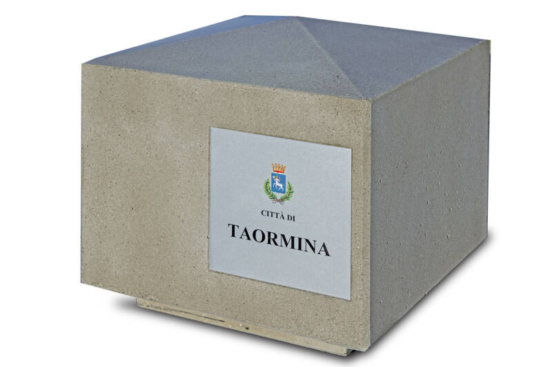 È un monoblocco realizzato in pietra ricostruita con finitura sabbiata + rivestimento acrilico idrorepellente trasparente. Il manufatto è dotato di un incavo per inserimento di una targa (optional) con logo del committente.